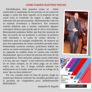 Estudiábamos días pasados como se había construido el andamiaje de los precios en un comercio amigo, y como Ud. bien supone, en la mayoría de los casos eran el resultado de seguir a algún colega referente del que desconocían absolutamente cuál era su manejo económico y financiero.