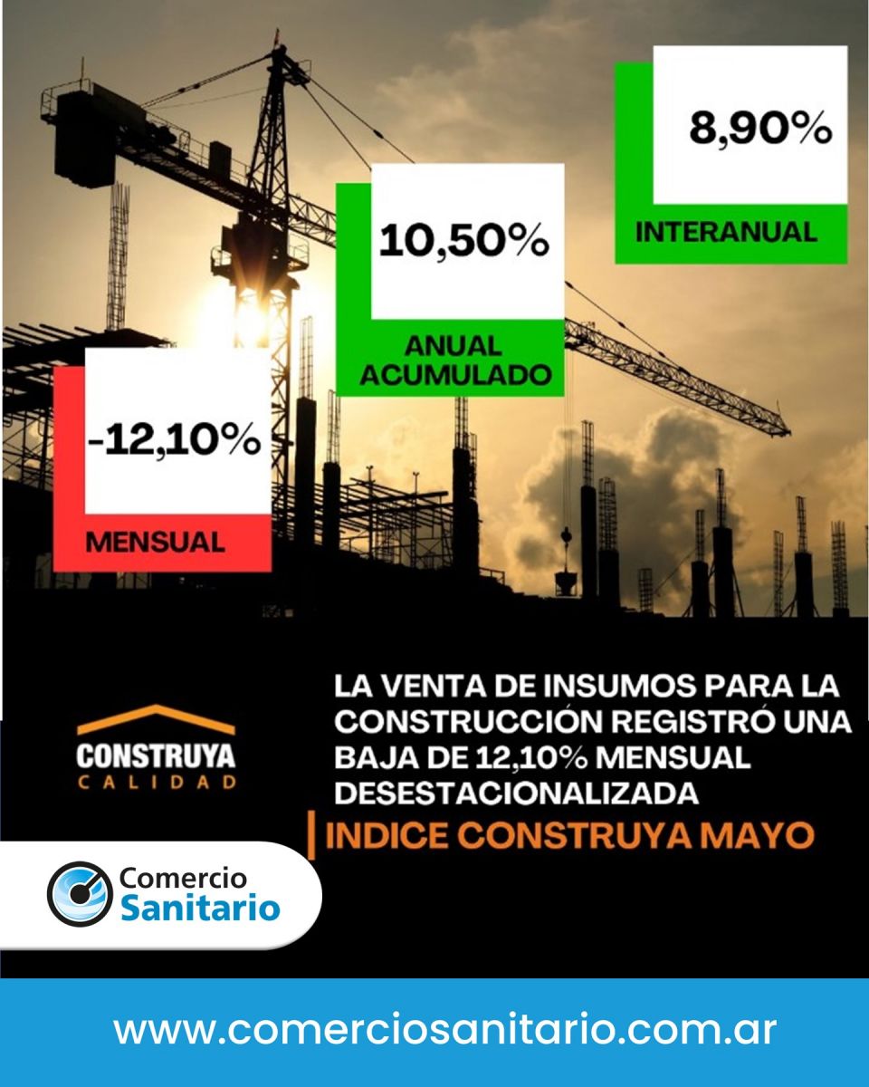 En mayo el Índice Construya (IC), que mide la evolución de los volúmenes vendidos al sector privado de los productos para la construcción que fabrican las empresas que lo conforman, registró una baja del 12,10% mensual desestacionalizada, y en la comparación interanual el IC registró una suba de 8,9%.