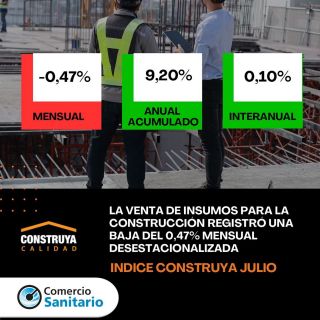En julio el Índice Construya (IC), que mide la evolución de los volúmenes vendidos al sector privado de los productos para la construcción que fabrican las empresas que lo conforman, registró una baja del 0,47% mensual desestacionalizada, y en la comparación interanual el IC registró una suba de 0,10%.