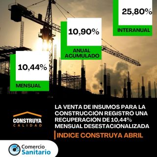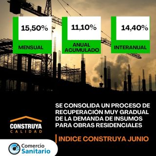 En junio el Índice Construya (IC), que mide la evolución de los volúmenes vendidos al sector privado de los productos para la construcción que fabrican las empresas que lo conforman, registró una recuperación del 15,50% mensual desestacionalizada, y en la comparación interanual el IC registró una suba de 14,4%.