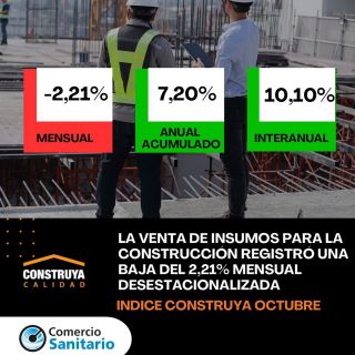 En octubre el Índice Construya (IC), que mide la evolución de los volúmenes vendidos al sector privado de los productos para la construcción que fabrican las empresas que lo conforman, registró una baja del 2,21% mensual desestacionalizada, manteniéndose en la comparación interanual 10,1% arriba. De esta forma, el acumulado de enero-octubre de 2025 cerró 7,2% por encima del mismo período del año anterior.