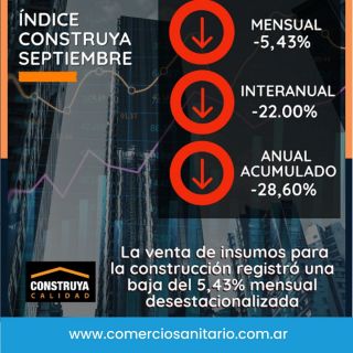 En septiembre, el Índice Construya (IC), que mide la evolución de los volúmenes vendidos al sector privado de los productos para la construcción que fabrican las empresas que lo conforman, registró una baja de 5,43% mensual desestacionalizada, y se mantuvo 22% por debajo del nivel de septiembre de 2023. 📉