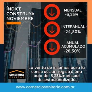 En noviembre el Índice Construya (IC), que mide la evolución de los volúmenes vendidos al sector privado de los productos para la construcción que fabrican las empresas que lo conforman, registró una baja de 3,23% mensual desestacionalizada, y se mantuvo 24,8% por debajo del nivel de noviembre de 2023.