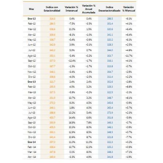 El Índice Construya (IC), que mide la evolución de los volúmenes vendidos al sector privado de los productos para la construcción que fabrican las empresas líderes que conforman el Grupo Construya (ladrillos cerámicos, cemento portland, cal, aceros largos, carpintería de aluminio, pisos y revestimientos cerámicos, adhesivos y pastinas, pinturas impermeabilizantes, sanitarios, grifería y caños de conducción de agua), registró un avance de 4,9% estable durante el primer cuatrimestre de 2014 en relación al mismo período de 2013. En abril las ventas de insumos de las empresas del Grupo corregidas por estacionalidad disminuyeron 1,86% respecto a marzo. Y al considerar la variación interanual, los volúmenes despachados en abril de 2014 fueron menores en 3,3%. A pesar de esto, durante el primer cuatrimestre del año el Índice Construya logró mostrar un avance importante en comparación con el mismo período del año anterior.