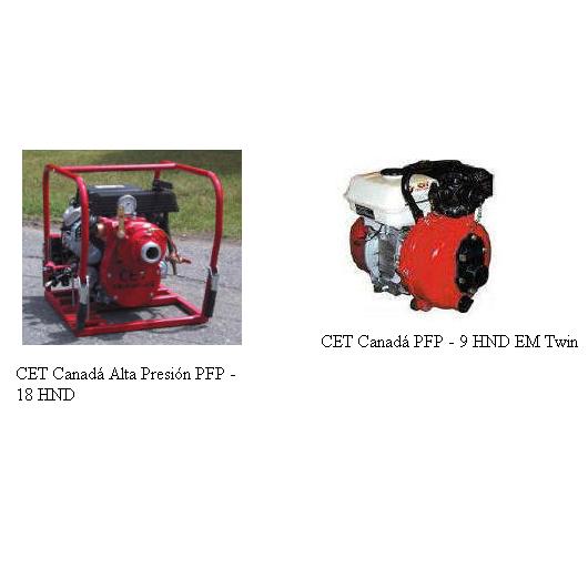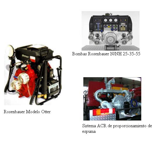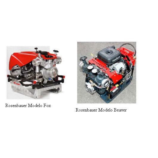 Rosenbauer Modelo FoxCaudales en litros minuto de 2.000 a 3 bares, 1.600 a 10 bares y 1.000 a 15 bares. Motor electrónico BMW de cuatrotiempos, dos cilindros, 67 HP (50 kW), refrigerado por aire. Sistemas automáticos de control de presión, vacío y dosificación de espuma. Arranque eléctrico y manual. Panel de control con cuenta revoluciones, cuenta horas y luces piloto de carga de batería, presión de aceite, combustible. Acoples de alimentación y expulsión de acuerdo a pedido del usuario.Rosenbauer Modelo BeaverCaudales en litros / minuto 1.200 a 6 bares, 750 a 10 bares y 375 a 12 bares. Puede trabajar con aguas sucias. Motor Briggs & Stratton modelo Vanguard de 35 HP (26 kW) refrigerado por aire de 2 cilindros. Tanque de combustible por separado, lo que facilita el reaprovisionamiento en forma segura y con una capacidad de 20 litros. Arranque eléctrico y manual. Incluye sistema de vacío semi automático, manovacuómetro, manómetro. Acoples de alimentación y expulsión de acuerdo a pedido del usuario.Rosenbauer Modelo OtterCaudales en litros / minuto: 1.100 a 3 bares, 1.000 a 4 bares, 800 a 5 bares y 500 a 6 bares. Motores a explosión de 4 tiempos a nafta y gas-oil refrigerados por aire. Sistema manual de succión. Manovacuómetro y manómetro. Arranque manual y eléctrico. Acoples de alimentación y expulsión de cuerdo a pedido del usuario.Bombas Rosenbauer N/NH 25-35-55Bombas combinadas de presión normal y de alta presión con 2500, 3500 y 5500 l/min. Manejo fácil y óptima ergonomía. Integración de sistemas de mezcla de espuma.Sistema ACR de proporcionamiento de espumaSistema ACR (Automatic Constant Rate) de proporcionamiento de espuma con bomba N100. Consiste en un módulo que comprende las bombas de agua y de emulsor con todos sus componentes de relación.CET Canadá Alta Presión PFP - 18 HNDCaudales en litros / minuto de 568 a 3,5 bares, 454 a 7 bares, 378 a 10 bares, 227 a 14 bares y 96 a 17 bares. Llegando a una presión máxima de 21 bares. Motor Honda de 4 tiempos de 18 HP (13 kW). Arranque eléctrico y manual. Tanque de 22 litros. Acoples de alimentación y expulsión de acuerdo a pedido del usuario.CET Canadá PFP - 9 HND EM TwinBomba CET (Canadá) de dos etapas, autocebante. Cuerpo e impulsores en aluminio, eje en acero inoxidable, sello mecánico. Equipada con motor Honda de cuatro tiempos con una potencia de 9 HP.