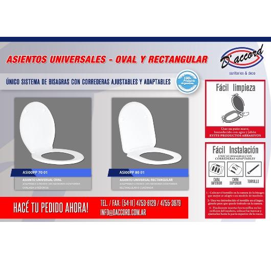 Cuando los usuarios deben reponer el asiento para su baño se encuentran ante el molesto problema de saber elegir correctamente el repuesto: medidas, materiales, viaje al sanitarista de confianza, charlas en la casa y un sinfín de pormenores hacen de esta situación una experiencia cuanto menos ajetreada.Es una situación que a mucho puede llevar a demorar la cuestión, hasta que el asiento del baño ya no soporte más ningún tipo de uso. Es por esto, que en D´accord ofrecemos una solución efectiva que logra evitar semejantes cuestiones para los usuarios que quieran invertir tiempo en ellos mismos y no en sus baños.Los asientos universales de D´accord permiten adquirir un único modelo que es capaz de adaptarse a cualquier asiento, la única variable que tenemos que tener en cuenta es la forma del mismo: ya sea si el asiento es oval o rectangular. Estas maravillas de la eficiencia práctica han facilitado la tarea de miles de usuarios a la hora de reponer su dañado asiento.El funcionamiento de los asientos es facilitado por un sistema de bisagras con correderas ajustables y adaptables, de muy fácil uso, pensado para que cualquier persona lograse su colocación exitosa.Los asientos universales de D´accord pueden encontrarse en los mejores sanitaristas y retails de todo el país.
