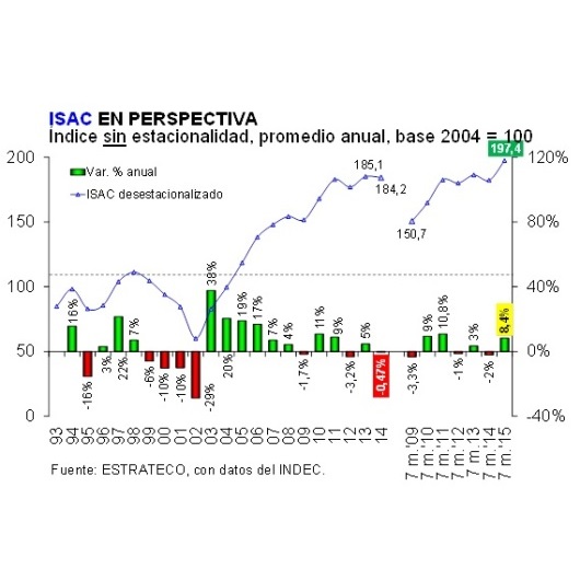 Actividad Sectorial – Crecimiento Interanual, Corrección Mensual Por Lic. Pablo A. Lara, ESTRATECO ConsultoresEn julio la actividad sectorial continuó expandiéndose a un elevado ritmo en términos interanuales, pero en relación al mes previo experimentó una leve caída. Junto al cemento portland, principal termómetro de la actividad sectorial, los despachos de ladrillos, pinturas y pisos y revestimientos, señalaron importantes subas con respecto al séptimo mes del año pasado. Y en agosto, el Índice Construya (IC), que mide los despachos para obra privada de las empresas que lo integran, también exhibió una suba significativa en comparación con agosto de 2014 y una corrección mensual (desestacionalizada). Los que se tomaron un respiro fueron los despachos de cemento portland, que en el octavo mes del año exhibieron la primera baja interanual (1,6%), luego de siete subas consecutivas y de seis récords históricos. Por su parte, el nivel de ocupación formal en el sector de la construcción siguió acompañando este proceso expansivo, lo cual resulta consistente con la expansión de las obras públicas en un año de extenso e intenso calendario electoral. A la inversa, la que sigue sin reaccionar es la superficie autorizada para construir en el conjunto de 42 municipios relevados por el INDEC.El Indicador Sintético de Actividad de la Construcción (ISAC) corregido por estacionalidad se ubicó en julio pasado 12,7% por encima de un año atrás, al tiempo que quedó apenas 0,2% por debajo el nivel alcanzado el mes anterior (éste último se mantuvo como el máximo de la serie histórica). De esta manera, en los primeros siete meses de 2015 el conjunto de los despachos enviados al mercado interno de los diez insumos principales relevados por el INDEC acumuló una suba de 8,5% interanual.Los despachos de ladrillos fueron los que más crecieron en julio de 2015, 28,7% interanual. En segundo lugar se ubicaron los de pinturas, que se expandieron 14,8% interanual, seguidos por los de pisos y revestimientos cerámicos, con un alza de 12,7%. Luego, en cuarto lugar, se ubicaron las entregas de cemento portland, que totalizaron 1,07 millones de toneladas. Este volumen fue 12,6% mayor al de julio de 2014 y marcó el sexto récord histórico del año. Completó el hierro redondo con una recuperación de 5,2% anual. En tanto, los despachos de asfalto marcaron una contracción de 2,6% interanual.En los primeros siete meses del año los despachos de cemento portland llegaron a 6,95 millones de toneladas y quedaron 11,3% por encima del mismo período del año anterior. Sólo las pinturas exhibieron un mayor dinamismo (16,7% anual). En tanto, los ladrillos acompañaron al cemento, con un avance de 11,1% anual, y las entregas de pisos y revestimientos cerámicos mostraron un alza de 2,0% anual. En tanto, los despachos de asfalto igualaron la marca de enero-julio de 2014, al tiempo que los de hierro redondo redujeron la contracción acumulada a sólo 1,2% anual.En particular, los despachos de cemento en bolsa ascendieron a 4,3 millones de toneladas en enero-julio de 2015, lo que representó un volumen 8,4% superior al de igual lapso del año pasado. Por su parte, los despachos a granel totalizaron 2,65 millones de toneladas y mostraron una expansión de 16,3% interanual, lo que les permitió ganar 1,6 puntos porcentuales de importancia relativa, llegando a representar 38,2% del total.En el período analizado las entregas de cemento portland crecieron en todas las regiones del país y en los dos formatos de ‘envase’. Las tasas de crecimiento interanual más importantes se registraron en el NEA, tanto para bolsa (12,1%; 8,8% del volumen total) como para granel (27,0%; 10,3% del volumen total). En el caso de la bolsa, la acompañaron Buenos Aires (11,0%; 38,9% del total) y Patagonia (10,6%; 6,9% del total). En el caso del granel, la siguieron el NOA (25,2%; 4,5% del total) y Centro (18,7%; 23,1% del total).En el caso del granel, cabe señalar que Cuyo, Patagonia y Buenos Aires también mostraron importantes subas, de dos dígitos interanuales en todos los casos (16,7%, 16,6% y 11,7%, respectivamente). En cambio, en la bolsa, Cuyo y Centro exhibieron mejoras de 7,4% y 6,0% anual, cada una, al tiempo que el NOA sólo mantuvo el nivel de los despachos de enero-julio de 2014.Cinco provincias explicaron 63,2% de los despachos de bolsa y 67,1% de los de granel en enero-julio del corriente año. Las cuatro primeras fueron Buenos Aires, Córdoba, Santa Fe y Mendoza. En tanto, la quinta fue Entre Ríos para la bolsa, y Neuquén para el granel. Del otro lado de la tabla, en el caso de la bolsa, se ubicaron Tierra del Fuego, Santa Cruz, La Pampa, Catamarca y Formosa, que en conjunto representaron 4,4% del total. Y en el caso del granel, Formosa, La Pampa, La Rioja, Catamarca y Tierra del Fuego, explicaron apenas 2,4% de los despachos del período considerado.Los siguientes dos gráficos muestran la variación interanual de los envíos en bolsa y a granel en cada una de las provincias, para el acumulado de los primeros siete meses de 2015.En julio, según el INDEC lideraron las obras residenciales y no residenciales privadas, con subas de 18,1% y 13,2% anual, respectivamente. En tanto, las obras públicas continuaron mostrando un elevado dinamismo. Las obras viales crecieron 9,1% anual y las otras de infraestructura hicieron lo propio en 11,4% anual. Sólo las construcciones petroleras retrocedieron, y a un ritmo importante (-16,5% interanual).En enero-julio del presente año las obras residenciales y las obras de infraestructura fueron las que más crecieron, 9,7% y 9,1% anual, en términos respectivos. Y el cuadro se completó con las obras privadas no residenciales (7,8%), las obras viales (5,2%) y las petroleras (2,0%). Conforme avanza el año, también se consolida la recuperación del nivel de ocupación formal en el sector de la construcción. Según las estadísticas (provisorias) del IERIC, en 