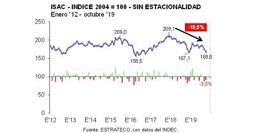 En octubre el Indicador Sintético de Actividad de la Construcción (ISAC) continuó retrocediendo. A la caída desestacionalizada (revisada) de 5,2% entre agosto y septiembre, se sumó una baja de 3,5% entre septiembre y octubre. La retracción post PASO anuló casi toda la recuperación (10,4%) que el ISAC desestacionalizado había registrado entre diciembre de 2018 y julio de 2019, que ahora quedó en 1,0%.