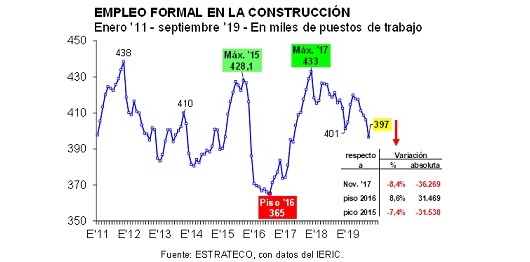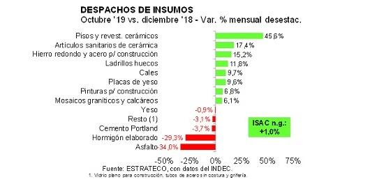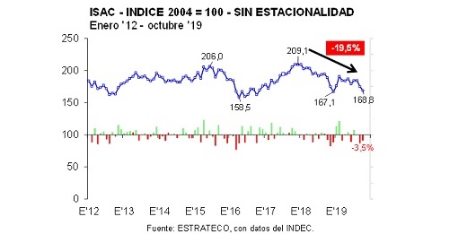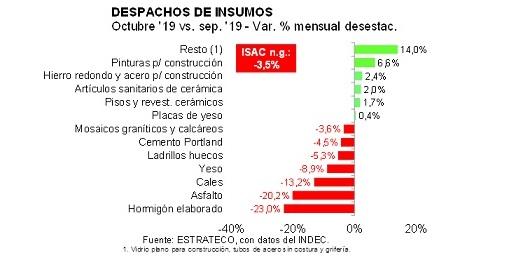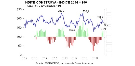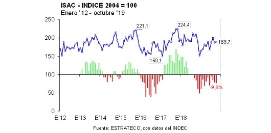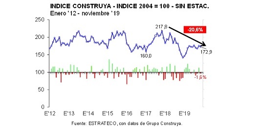 Informe EconómicoOctubre mostró una nueva caída de los despachos, pero rebote de la superficie permisada.En octubre el Indicador Sintético de Actividad de la Construcción (ISAC) continuó retrocediendo. A la caída desestacionalizada (revisada) de 5,2% entre agosto y septiembre, se sumó una baja de 3,5% entre septiembre y octubre. La retracción post PASO anuló casi toda la recuperación (10,4%) que el ISAC desestacionalizado había registrado entre diciembre de 2018 y julio de 2019, que ahora quedó en 1,0%.En tanto, quedó 19,5% por debajo del máximo alcanzado en noviembre de 2017. Los mayores retrocesos se observaron en asfalto y hormigón elaborado, y en menor medida en cemento, cales, yeso y ladrillos huecos. Por su parte, en noviembre el Índice Construya (IC) corregido por estacionalidad interrumpió el rebote de octubre, con una caída de 1,6% mensual. Con estos guarismos, entre puntas de 2019 la recuperación del IC desestacionalizado quedó en 22,1% y respecto al máximo de noviembre de 2017 la contracción acumulada se ubicó en 20,6%. En septiembre la cantidad de puestos de trabajo formales en la construcción fue de 396.545 y quedó 4,6% por debajo del nivel observado en el mismo mes de 2018. En lo que respecta al futuro próximo de las obras privadas, en el décimo mes del año la serie de superficie autorizada para construir registró un rebote, luego de la brusca caída observada en septiembre.La retracción post PASO anuló casi toda la recuperación (10,4%) que el ISAC desestacionalizado había registrado entre diciembre de 2018 y julio de 2019. De esta forma, entre puntas del año (octubre ’19 vs. diciembre ’18) acumuló una mejora de apenas 1,0% y quedó 19,5% por debajo del máximo alcanzado en noviembre de 2017. Los mayores retrocesos se observaron en asfalto y hormigón elaborado, y en menor medida en cemento, cales, yeso y ladrillos huecos.La serie del ISAC con estacionalidad exhibió una caída de 9,5% interanual (14º caída consecutiva), acumulando en los primeros diez meses del año baja de 8,3%.En noviembre el IC corregido por estacionalidad interrumpió el rebote de octubre, con una caída de 1,6% mensual. Con estos guarismos, entre puntas de 2019 la recuperación del IC desestacionalizado quedó en 22,1% y respecto al máximo de noviembre de 2017 la contracción acumulada se ubicó en 20,6%.En la comparación interanual el IC con estacionalidad mostró por segundo mes consecutivo una recuperación de 12,7% (en octubre había sido de 8,8%), luego de haberse retraído durante 16 meses. De esta forma, en los primeros once meses la caída se redujo a 8,9% respecto de enero-noviembre de 2018.En línea con lo establecido más arriba, entre septiembre y octubre se observaron importantes caídas en hormigón elaborado (-23,0%), asfalto (-20,2%) y cales (-13,2%). En tanto, se observaron bajas también en yeso (-8,9%), ladrillos huecos (-5,3%), cemento Portland (-4,5%) y mosaicos graníticos y calcáreos (-3,6%). Pero, el agregado ‘vidrio plano para construcción, tubos de acero sin costura y grifería’ mostró un rebote muy significativo (+14,0% mensual), que fue seguido de lejos por pinturas para construcción (6,6%), hierro redondo y acero para construcción (2,4%), artículos sanitarios de cerámica (2,0%), pisos y revestimientos cerámicos (1,7%) y placas de yeso (0,4%).En octubre el conjunto de los despachos de insumos relevados por el INDEC en el ISAC continuó retrocediendo. A la caída desestacionalizada (revisada) de 5,2% entre agosto y septiembre, se sumó una baja de 3,5% entre septiembre y octubre. De esta forma, y considerando el estancamiento de agosto (0,0% mensual), en los últimos tres meses el ISAC acumuló una contracción de 8,5%. En el mismo trimestre el IC mostró una disminución mucho menor (-0,6%).Entre diciembre de 2018 y octubre de 2019 la mayoría de los despachos de insumos registró un rebote, tras el frenazo que se verificó entre abril y diciembre del año pasado. No obstante lo cual y producto de las reversiones que se produjeron post PASO en las entregas al mercado interno de cemento, hormigón elaborado y asfalto, hicieron que la recuperación del ISAC casi se anulara (quedando en +1,0%). Los despachos de asfalto acumularon una caída de 34,0% entre puntas del año, los de hormigón elaborado, otra de 29,3%, los de cemento Portland, una de 3,7%, los del agregado ‘vidrio plano para construcción, tubos de acero sin costura y grifería’, una baja de 3,1% (aún a pesar del rebote de octubre señalado más arriba), y los de yeso, una caída de 0,9%.Entre los materiales que vieron recuperar sus despachos entre diciembre del año pasado y octubre del corriente año se contaron: pisos y revestimientos cerámicos (45,6%), artículos sanitarios de cerámica (17,4%), hierro redondo y acero para construcción (15,2%), ladrillos huecos (11,8%), cales (9,7%), placas de yeso (9,6%), pinturas para construcción (6,8%), y mosaicos graníticos y calcáreos (6,1%).En septiembre la cantidad de puestos de trabajo formales en la construcción fue de 396.545 y quedó 4,6% por debajo del nivel observado en el mismo mes de 2018. Es decir que el sector perdió casi 19 mil puestos de trabajo en los últimos doce meses considerados. Cuando se compara con el pico que se alcanzó en noviembre de 2017, la retracción llegó a 8,4% (-36,3 mil puestos de trabajo), en tanto que la ocupación formal resultó 8,6% mayor al último piso registrado en julio de 2016 (+31,5 mil puestos de trabajo).En lo que respecta al futuro próximo de las obras privadas, en el décimo mes del año la serie de superficie autorizada para construir registró un rebote, luego de la brusca caída observada en septiembre.La superficie autorizada para realizar obras privadas (nuevas y ampliaciones) en los 60 municipios que releva habitualmente el INDEC llegó a 770,1 mil metros cuadrados en octubre de 2019. En la comparación interanual resultó 6,7% mayor (+48,2 mil met