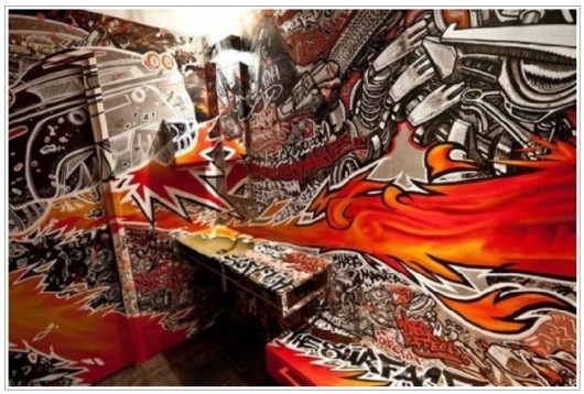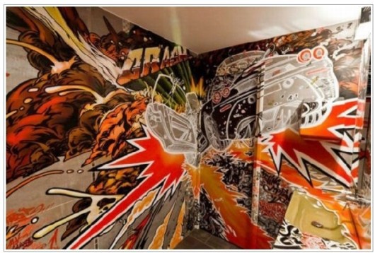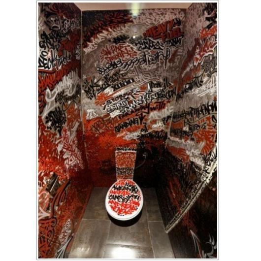 Un par de baños extravagantes.Es común encontrar en cualquier baño público algún tipo de expresión artística aunque es poco probable que disfrutemos de verdaderas obras de arte, sin embargo los baños que apreciarán ofrecen una visión singular.Por otro lado,no creo que los temas abordados sean adecuados para este tipo de lugar, pero es probable que la percepción ofrecida ayude a incrementar nuestras opciones de decoración, pues cuando se trata de baños a veces se sienten limitaciones debido a las alternativas disponibles en el mercado.