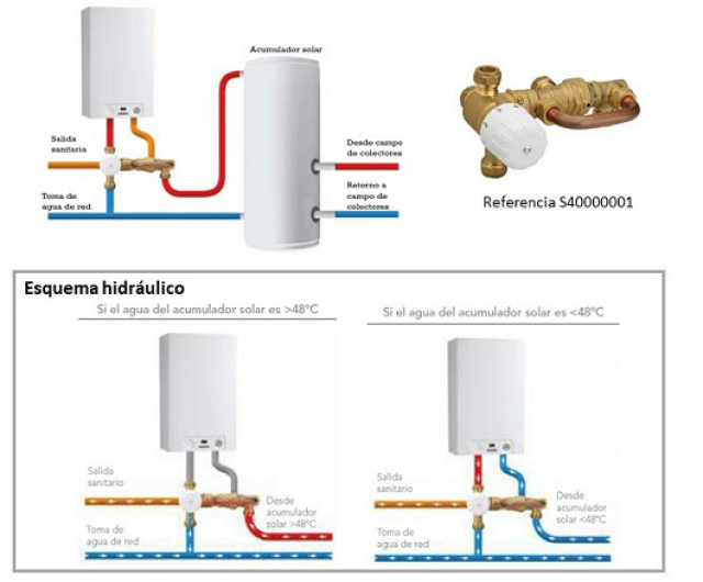 Kit Sanitario Solar.Kit Sanitario Solar: confort para tu hogar, protección para tu calderaKit Universal para conexión de acumulador solar con fuente de agua caliente sanitariaOrkli presenta Kit Sanitario Solar: Es un conjunto de conexión a los equipos auxiliares de calentamiento de agua sanitaria que se instalan entre el acumulador solar y la fuente de apoyo de energía, normalmente una caldera, un calentador o un termo eléctrico. Incorpora una válvula de 3 vías que decide si el agua proviene del acumulador solar debe pasar por la fuente de apoyo o puede ser directamente llevada a consumo; y una válvula mezcladora que regula la temperatura de salida de agua caliente sanitaria del sistema solar + apoyo convencional.