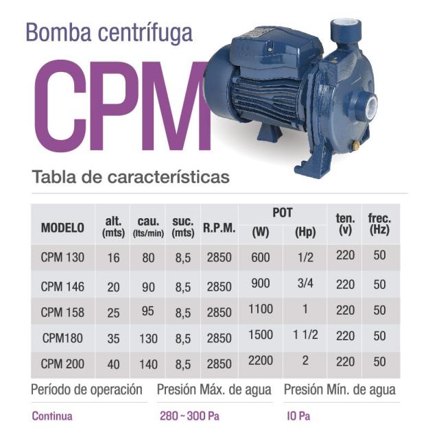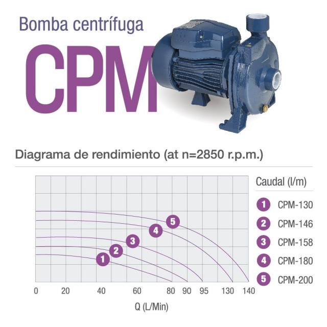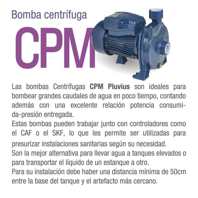 Las bombas centrífugas CPM Pluvius son ideales para bombear grandes caudales de agua en poco tiempo, contando además con una excelente relación potencia consumida-presión entregada.